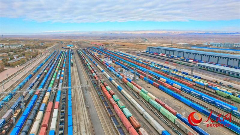 阿拉山口站编组场内停靠着待发的中欧班列及其他出入境货物列车。人民网 李欣洋摄