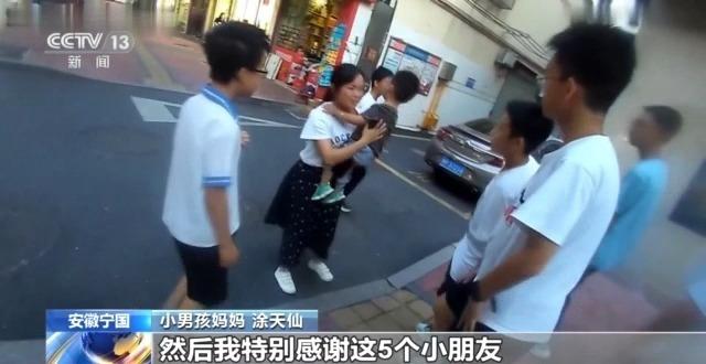 小男孩妈妈涂天仙:当时特别着急,我当时沿着商铺就一直找一直看,看到我的儿子我就冲上去抱着他,我特别感谢这五个小朋友。