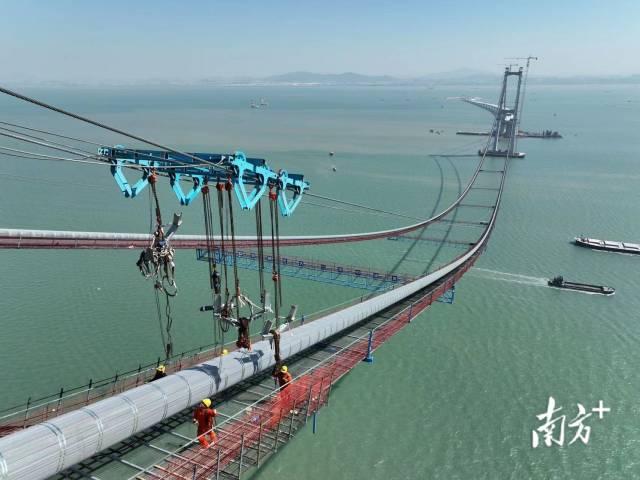 建设者徒步在深中大桥施工猫道上,正在进行主缆架设作业。