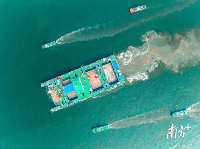 浮运安装一体船正提带深中通道沉管隧道管节进行浮运作业。