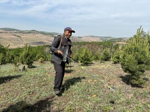只身住在山里25年,他有些不太愿意交流。当我们说想看看他种的树时,他麻利地配好了除草剂。
