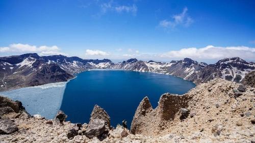 2024年5月24日,冰层逐渐消融的长白山天池。新华社记者颜麟蕴 摄