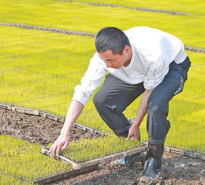 秧苗盘里,半沙半泥的土壤伴之以谷糠,很疏松。“这样能防止土壤板结,也更有营养。”冷辑龙说,有了营养,种子才能在30天左右的时间里慢慢发芽,再破土而出,成长为秧苗。“如果土壤板结了,种子在育秧环节就会被浪费掉。”冷辑龙说。
