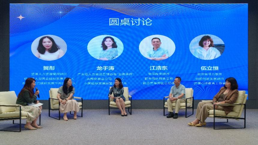 资深人力资源管理顾问贺彤(左二)、资深人力资源管理顾问龙于涛(左三)、资深投资顾问江浩东先生、资深领导力教练伍立恒(右一)在圆桌讨论环节就《大学生就业优势早培养》议题进行深入探讨