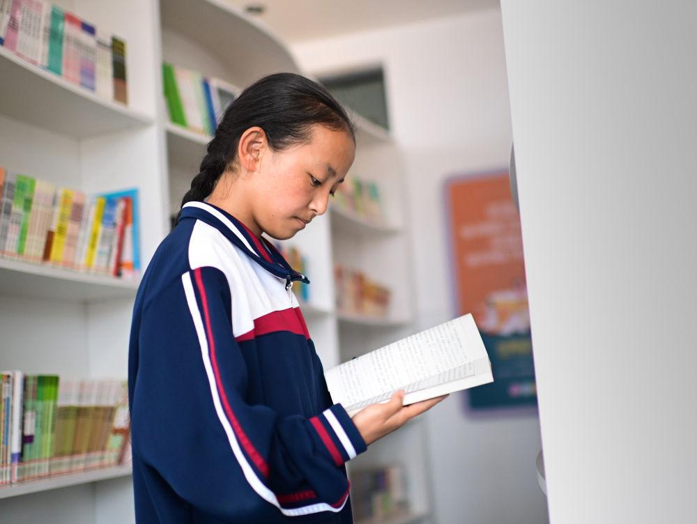 6月18日,果洛西宁民族中学学生尼东拉毛在图书室看书。