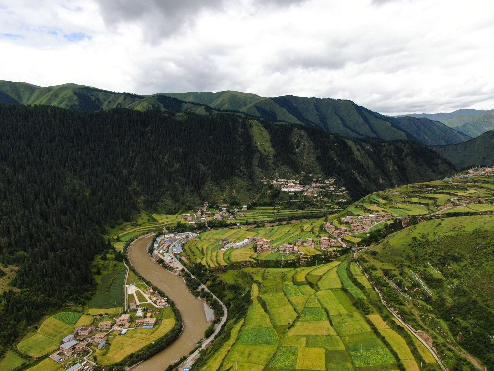 青海省果洛藏族自治州班玛县境内拍摄的村庄景色(2021年8月7日摄,无人机照片)。