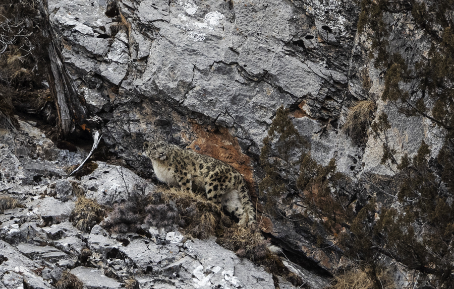 2023年2月21日,在青海省玉树藏族自治州杂多县昂赛乡境内的昂赛大峡谷内,一只雪豹准备向上攀爬。新华社记者 费茂华 摄