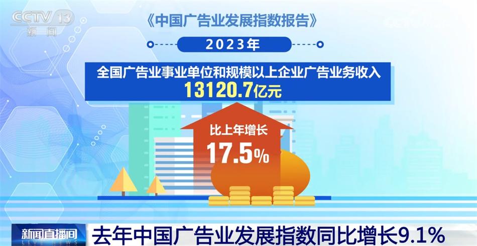 《中国广告业发展指数报告》显示,我国广告业规模快速提升,产业活力不断释放。2023年,全国广告业事业单位和规模以上企业广告业务收入13120.7亿元,比上年增长17.5%,广告市场规模占全球比重进一步提高,继续稳居世界第二。