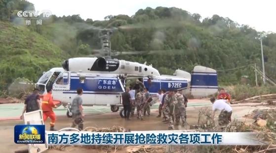 广东调动各方力量深入一线,积极开展抢险救灾。在受灾较重的梅州平远、蕉岭等地,水毁道路正在加紧抢通,广东省应急航空救援中心出动航空救援直升机,向受灾村庄运送发电机、食品、饮用水等物资,同时将被困群众和受伤人员转移出来。