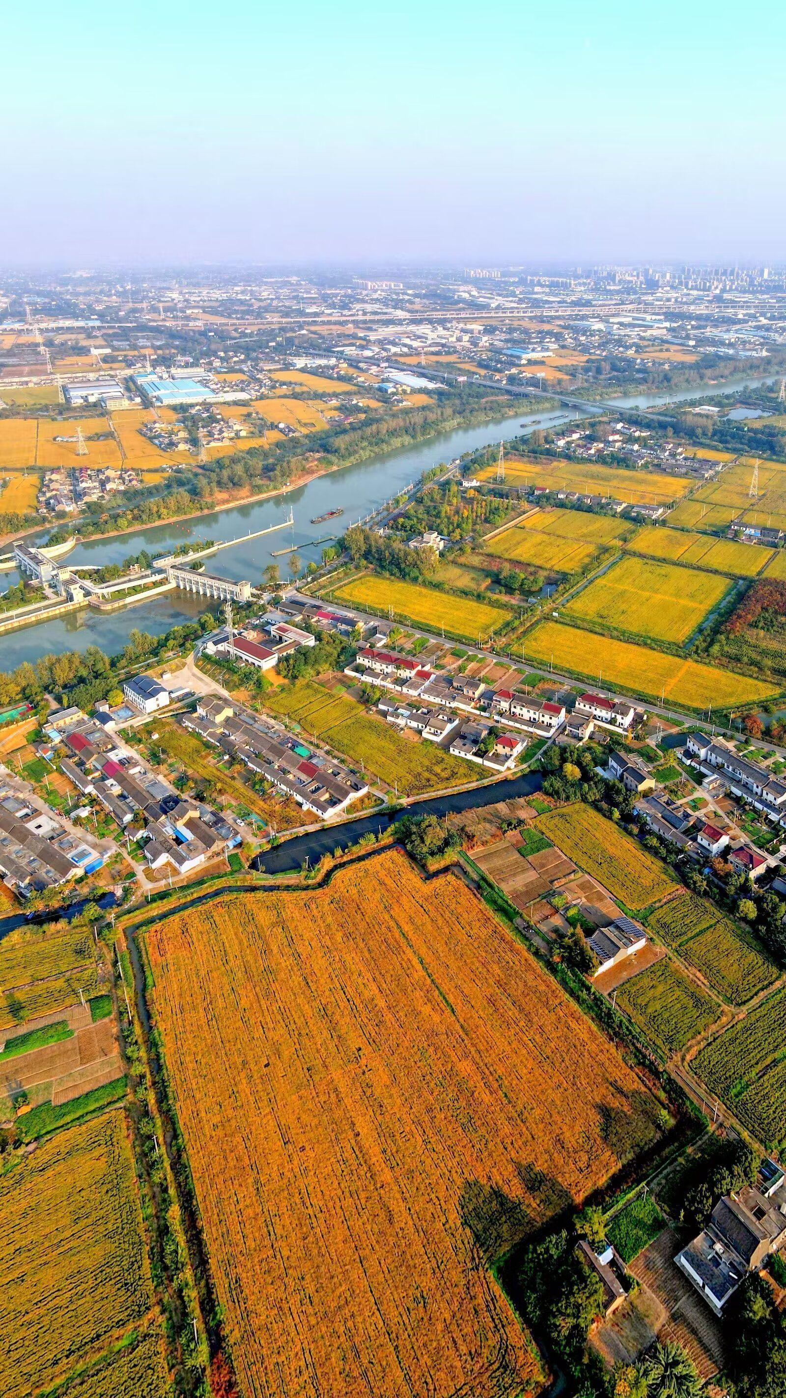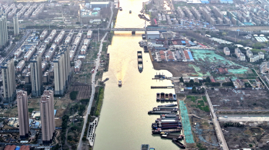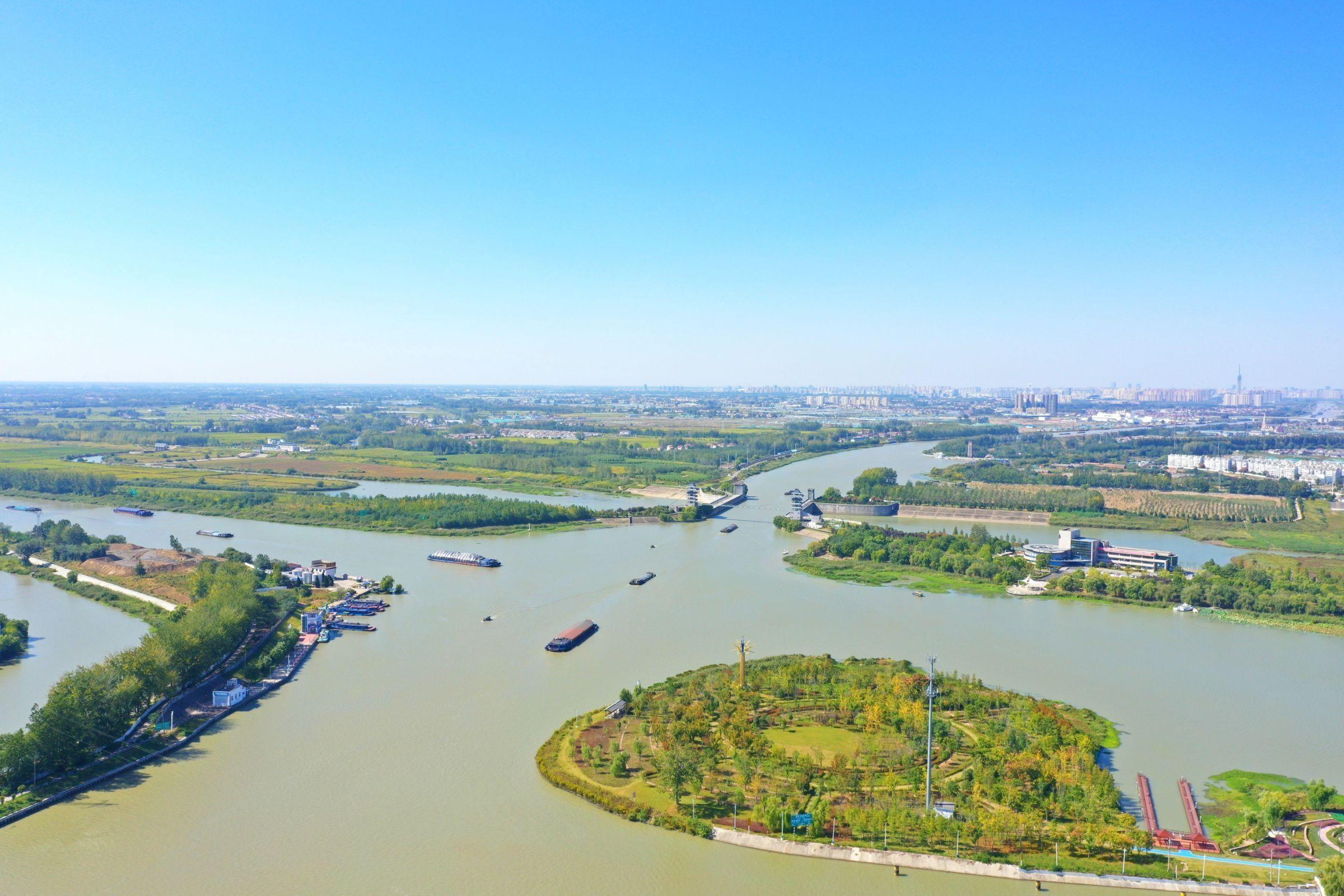 苏北运河高邮段(高邮城区段)。图中小岛为高邮镇国寺,为这个“岛”运河改迁“道”。苏北运河高邮段承担着运输和灌溉等重要功能,该段运河是京杭大运河全线运输最繁忙的航段之一。拍摄者:张德春
