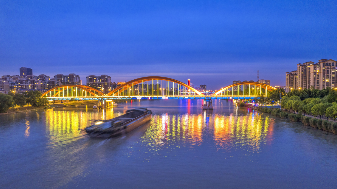 在宿迁市宿豫区,当夜幕降临,运河两岸的灯火逐渐亮起,璀璨的光芒映照在水面上,波光潋滟,如同无数繁星坠落人间 拍摄者:朱波