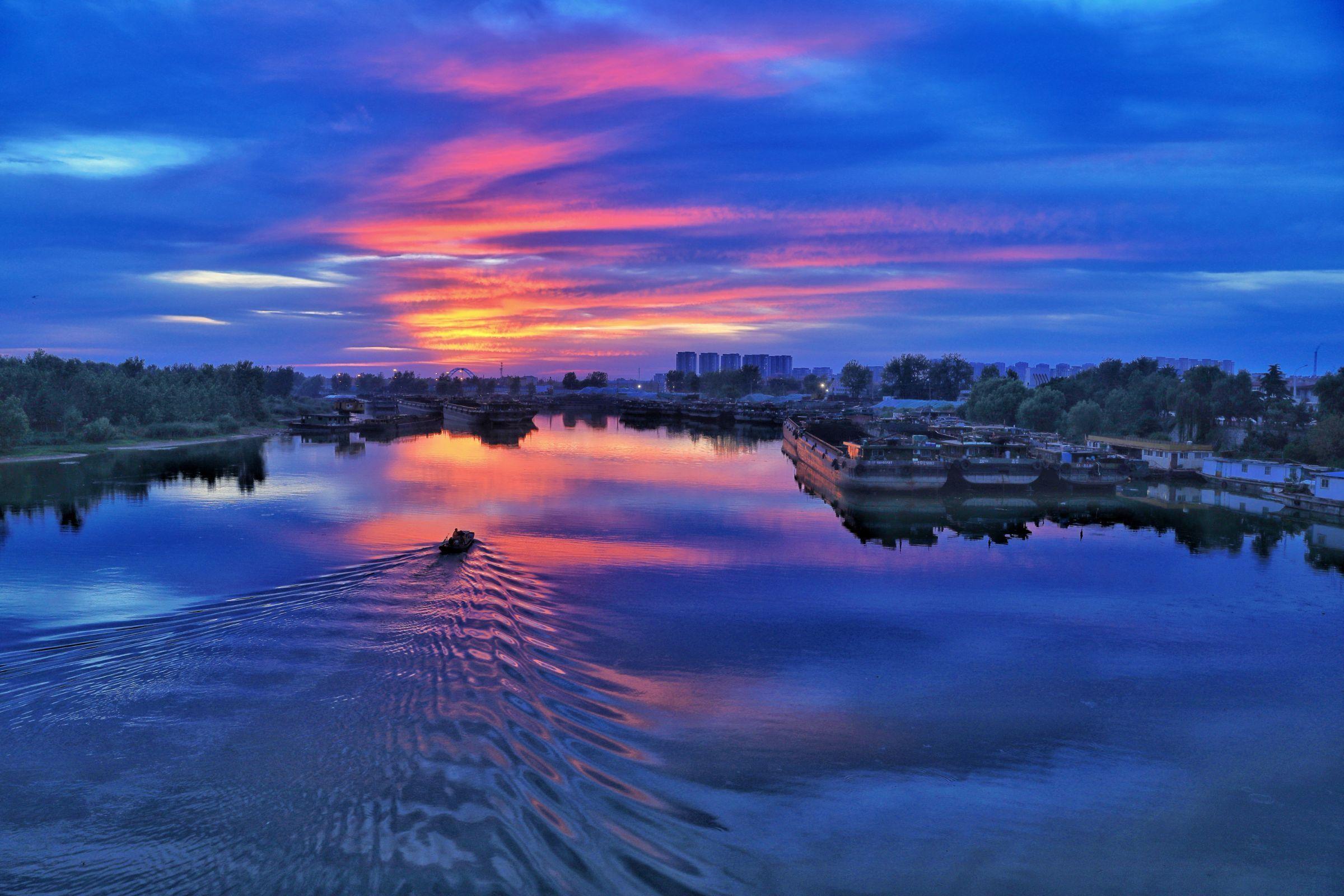 在京杭大运河邳州段,蓝调时刻的天空、红红的晚霞、小船荡漾的水波与静静的港湾构成的一幅美丽画面。拍摄者:张延青