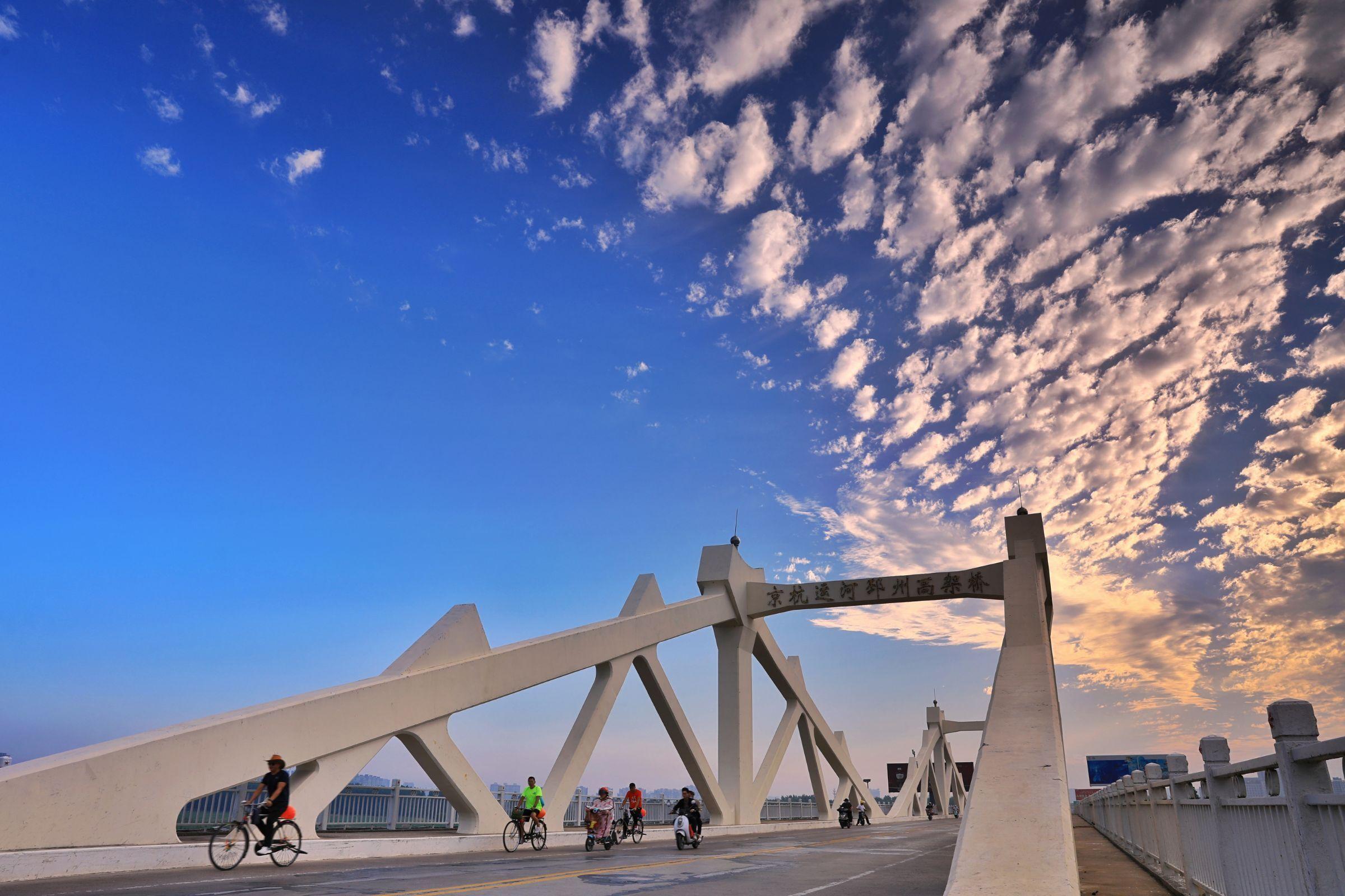 清晨,京杭大运河邳州高架桥上,几位骑行者迎着晨光经过大桥。拍摄者:张延青