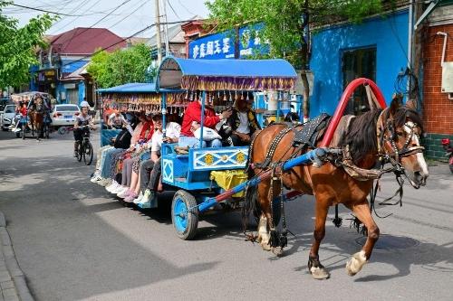在伊犁哈萨克自治州伊宁市喀赞其民俗旅游区,游客乘坐马车观光游览(5月10日摄)。新华社记者 丁磊 摄