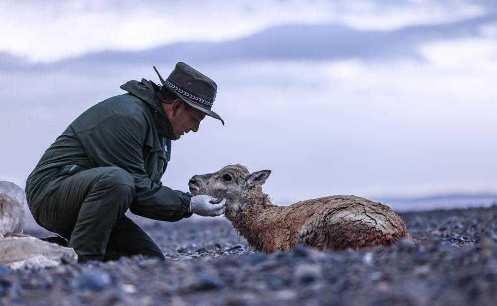 羌塘国家级自然保护区的野保员在安抚受伤的母藏羚羊(6月14日摄)。新华社发(旦增摄)