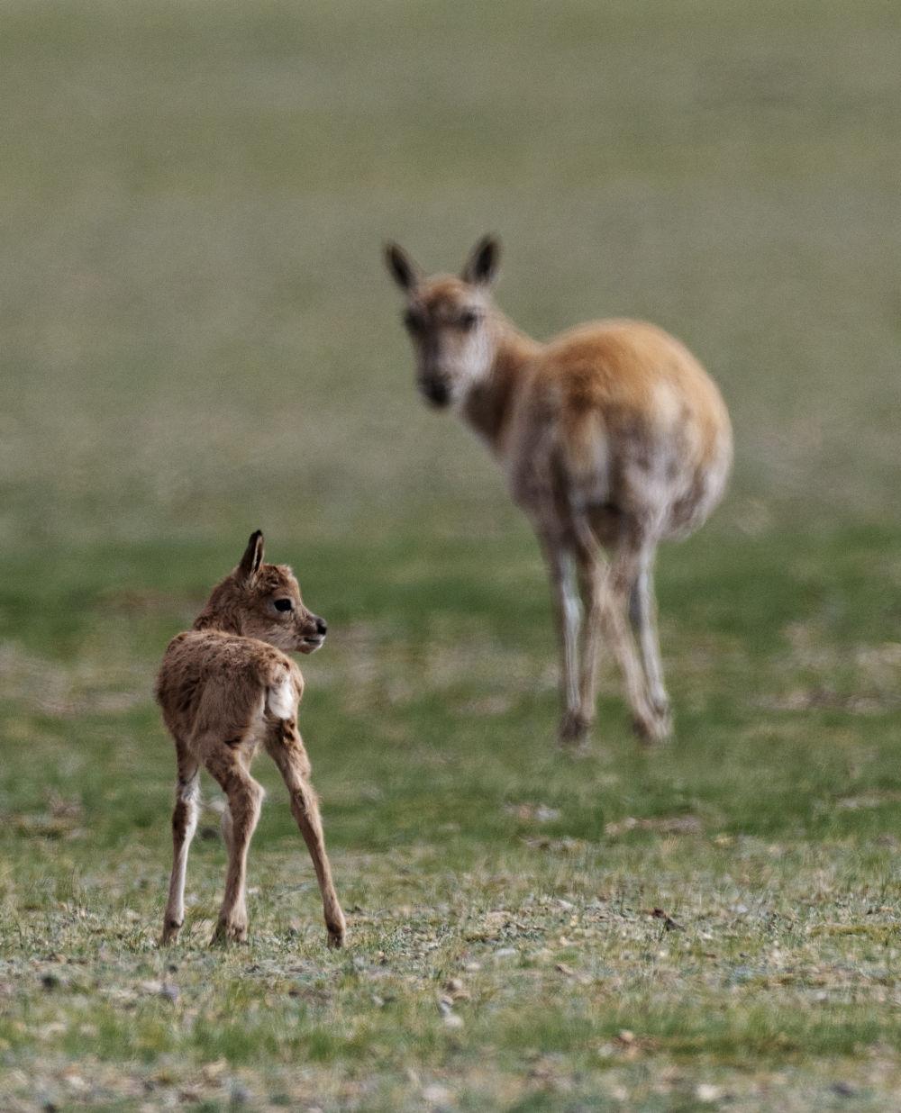 6月17日,在鲁确塘草原,一只刚出生不久的小藏羚羊跟着母藏羚羊在草原上漫步。新华社记者 费茂华 摄