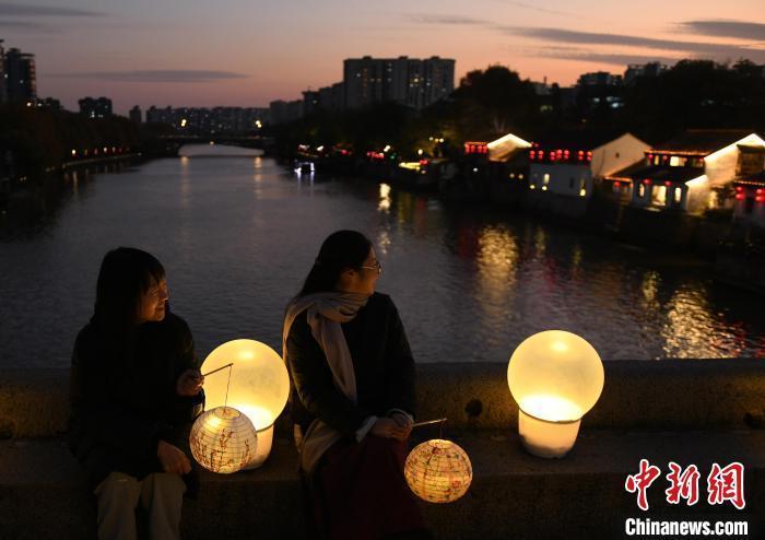 资料图:中国大运河南端拱宸桥,游客提灯观景。中新社记者 王刚 摄