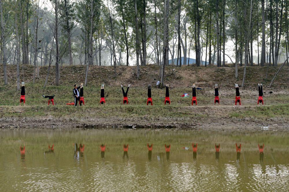 2014年10月24日,吴桥国际杂技艺术学校的学生们在大运河边练功。