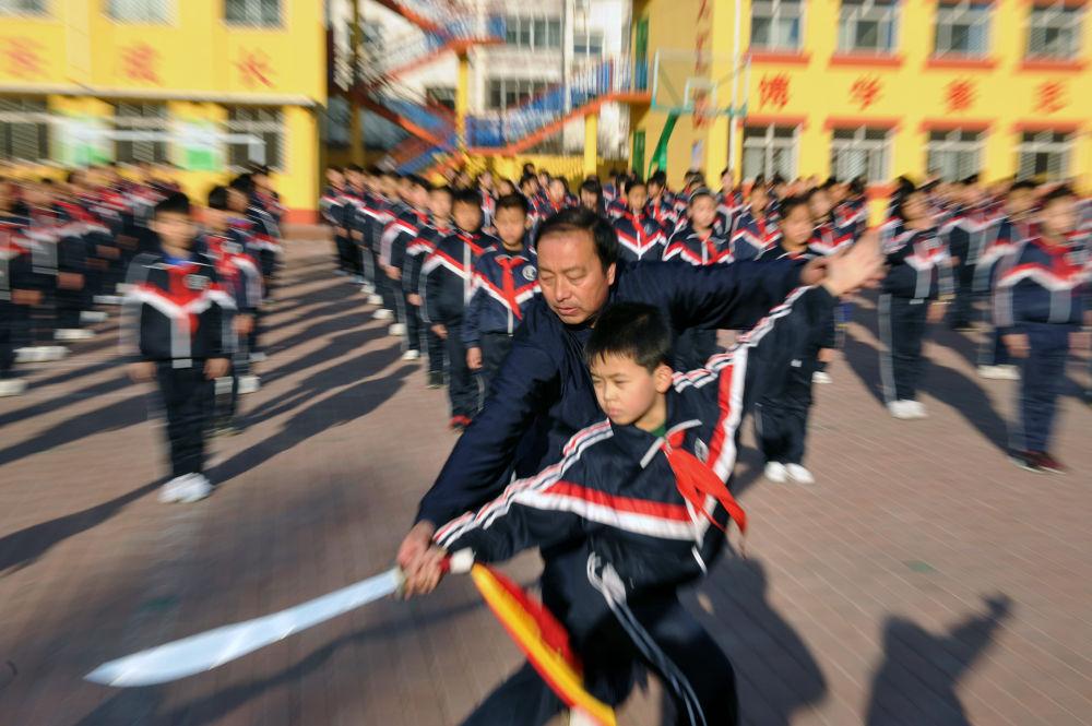 2017年12月8日,泊头市东方小学学生在六合拳传承人石同鼎的指导下学习六合拳器械。