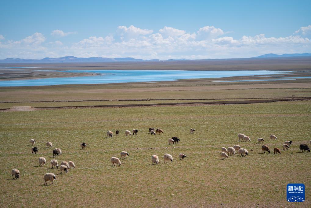 6月22日,羊群在色林错湖畔草场上吃草。