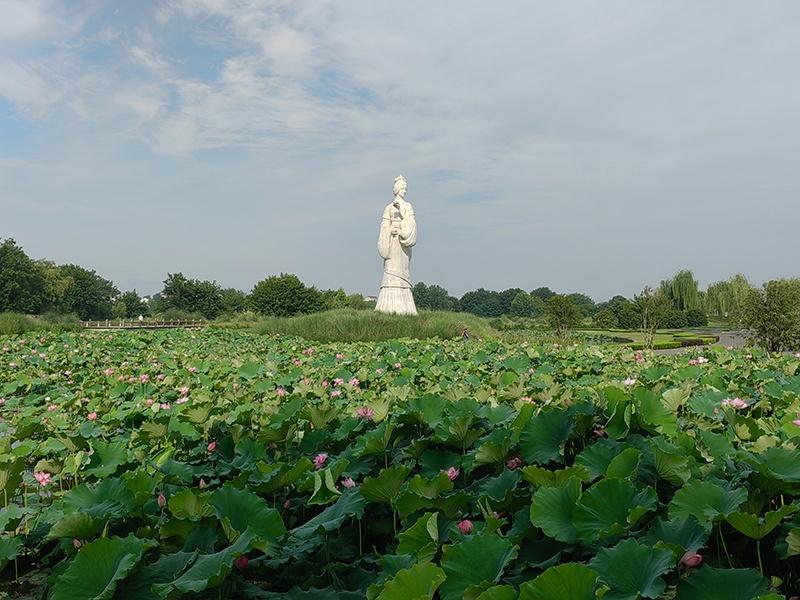 下得车来,置身其中。天汉湿地公园风光正好,一处绿地,颇具汉风的天汉楼阁高耸入云,俯瞰湿地,似乎给每一位游客讲述着两汉三国的历史过往和千古风流人物。与之呼应的是一尊柔美的汉白玉窈窕淑女——汉水女神像,宛在水中央,尽展着汉家妹子纯洁无瑕,勤劳质朴的高贵品质。四周曲水流觞,荷叶连连,芙蓉争艳,引得留恋蝴蝶时时舞。