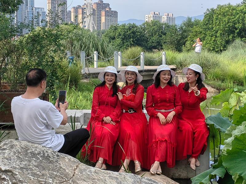 “这一块不错,你快点过来,赶紧给我们几个拍照呀!”循声找去,荷塘观景平台处,四位女子一袭红裙子,一样的奶白色遮阳帽,随意坐在一起,招呼一位随行男子拍照。她们的欢声笑语引起了众人的关注,自然也成了记者镜头里的一道风景。