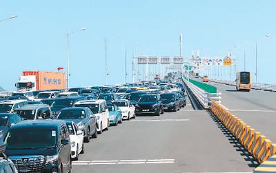 港珠澳大桥桥头等待北上的车辆。王相国摄(新华社发)
