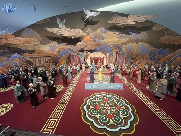 博物馆中,还有一组雕像还原了隋炀帝西巡时万国盛会的盛况。“他曾在张掖举办万国盛会,当时西域27国的使臣来到张掖,拜会隋炀帝,这应该说是隋炀帝人生当中最高光的时刻,也是隋朝最为强盛的时刻。”束家平说。