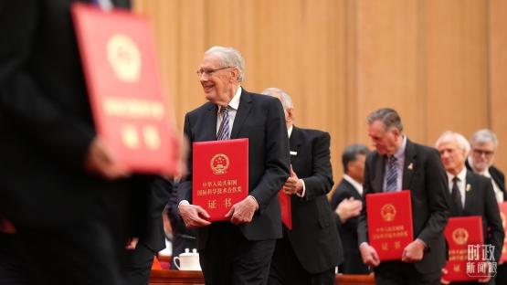 △获奖的外籍科技工作者,奖章的背面刻有获奖者姓名。(总台国广记者李晋、央视记者姚瑶拍摄)