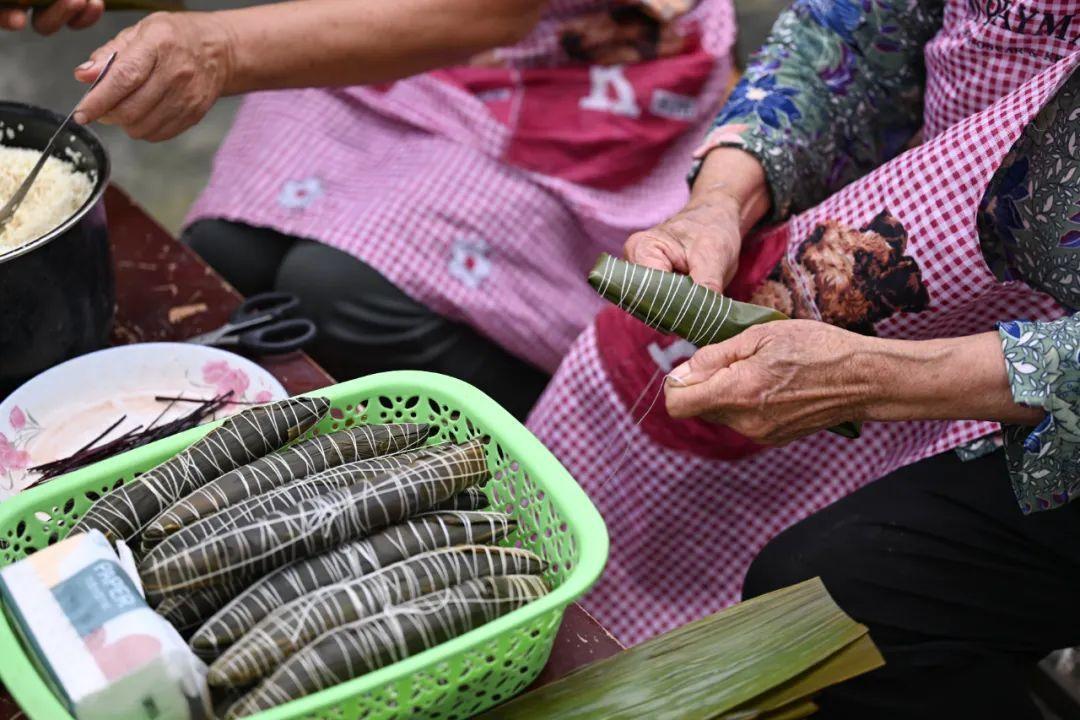 端午时节,粽香阵阵,只见她们手法娴熟,谈笑间,粽叶在她们手中翻飞、收拢,捆扎匀称。粽叶的清香和古建筑的古色古香,以及散学归来的孩童的欢声阵阵,为端午这个传统节日增添了几分温馨与热闹。