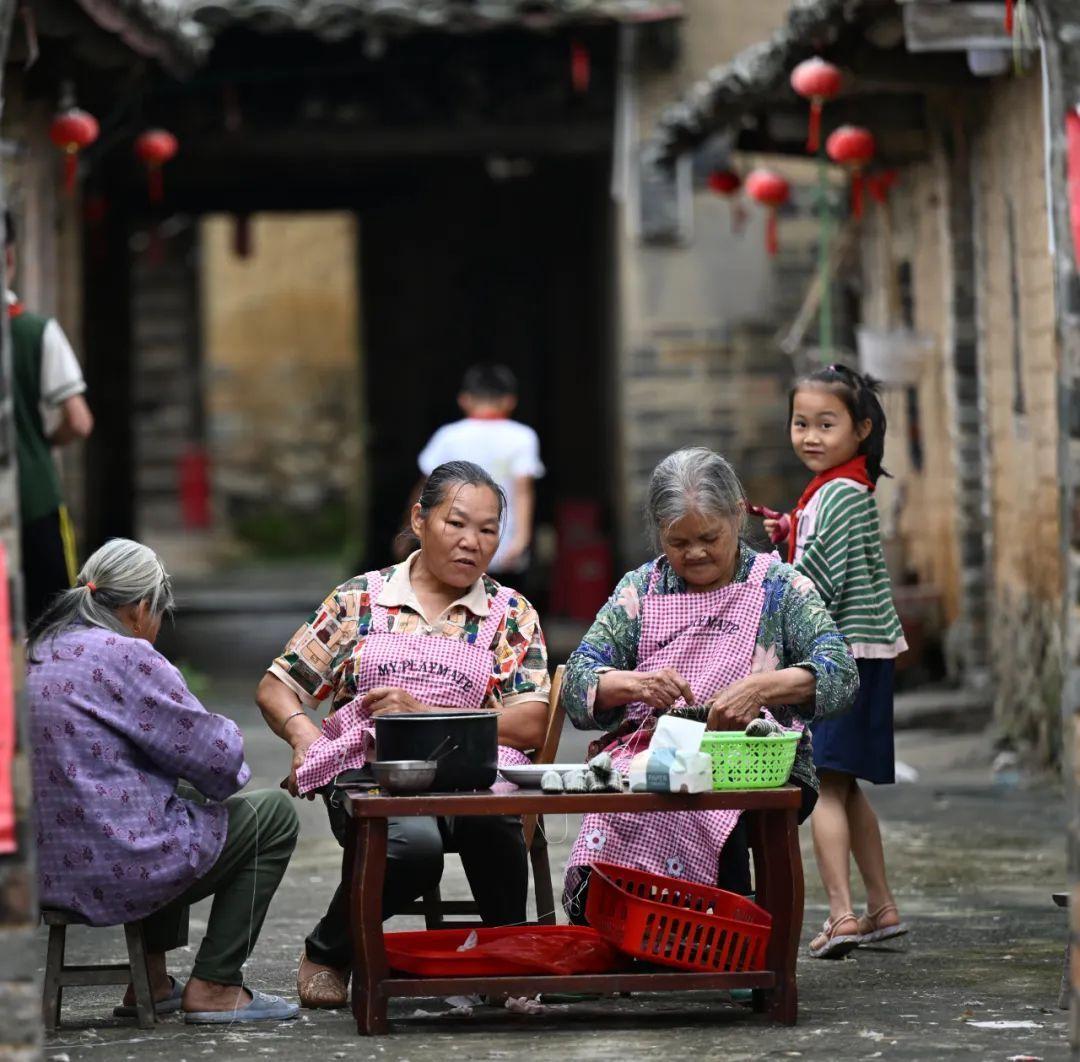 沿着回廊巷道进入古建筑群院落内,只见几位闲聊正欢的大姐和阿婆正在包粽子,这是当地端午节特有的仪式感。她们包的粽子当地人叫凉粽,又称灰水粽。见到客人来访,她们热情招呼着一起吃粽子,软糯的粽子蘸上蜂蜜或白糖,和生活一样甜。