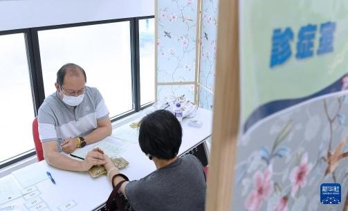 4月11日,在荃湾区马湾中医义诊活动中,一名中医师为居民号脉。新华社记者陈铎摄