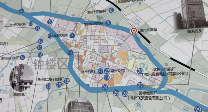 大运河常州段是中国运河史上最悠久的河段之一,早在公元前495年,吴王夫差开挖了自望亭抵常州的运河,奠定了常州运河水系的主要框架。展馆入口处一张地图展示了常州“因河而生,城河相依”的地理风貌——大运河穿城而过,形成一只巨大的“运河之眼”,38处工业遗存散落其间。