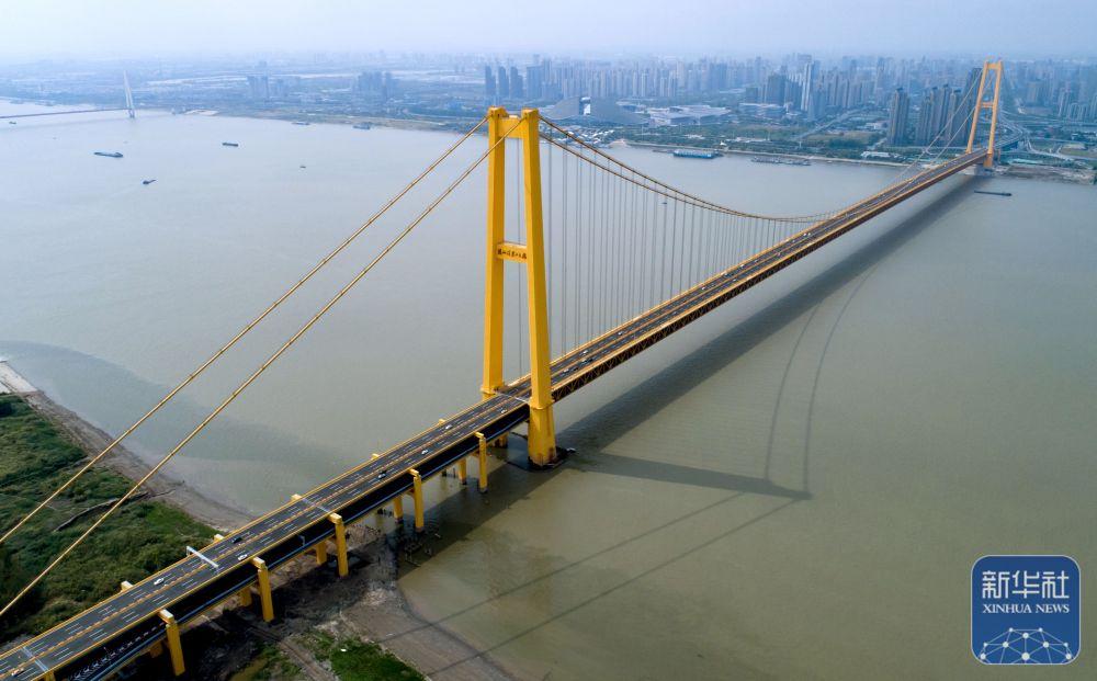 ↑这是2019年10月8日拍摄的武汉杨泗港长江大桥(无人机拍摄)。2019年,武汉杨泗港长江大桥通车,该桥全长4.13公里,主跨1700米。新华社记者 熊琦 摄