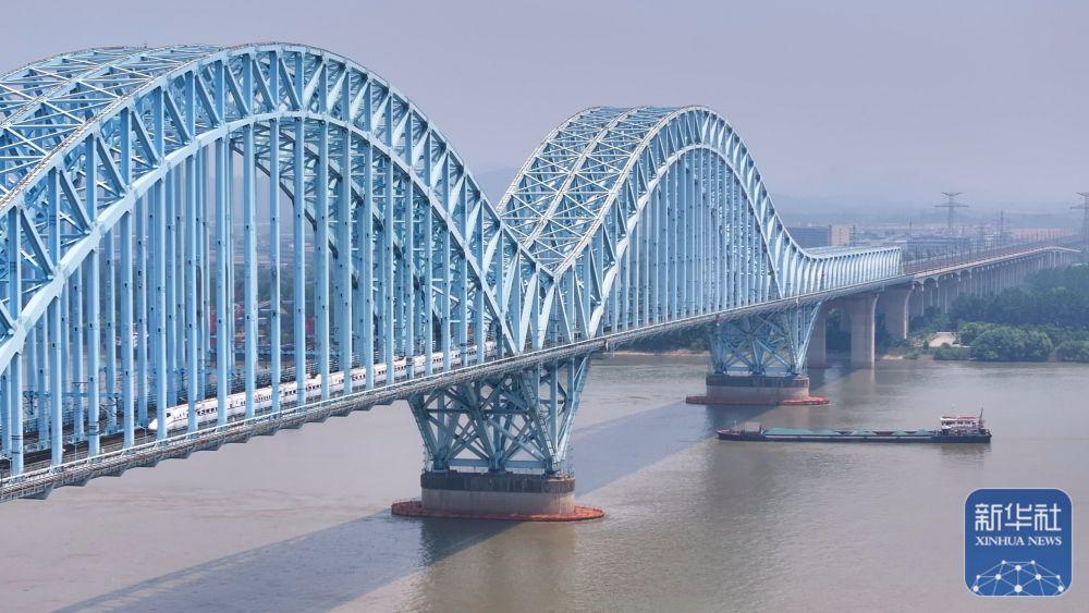 ↑2024年6月15日,超级“环线”列车通过南京大胜关长江大桥。京沪高铁南京大胜关长江大桥于2011年建成通车。新华社发(陈丹驰 摄)