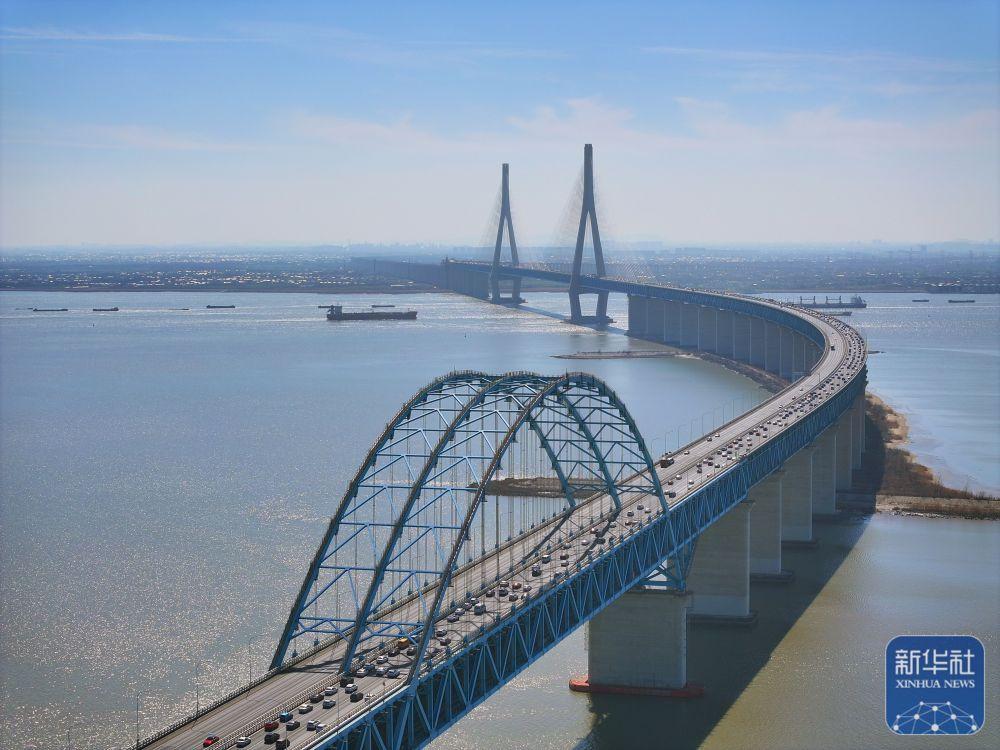 ↑这是2024年2月16日在江苏南通拍摄的沪苏通长江公铁大桥(无人机照片)。2020年7月1日沪苏通长江公铁大桥正式开通,该桥是集合高速公路、客货混线铁路和高速铁路“三合一”的过江通道。新华社发(许丛军摄)