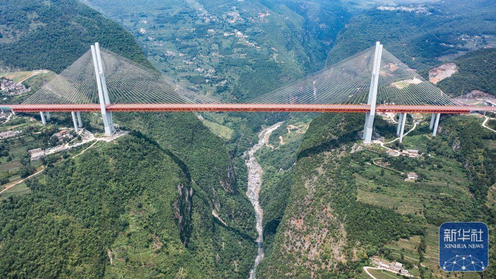 ↑这是2023年8月15日拍摄的贵州、云南交界处的杭瑞高速北盘江大桥(无人机照片)。于2016年12月通车的北盘江大桥连接起了被峡谷隔绝的滇黔两地,垂直高度达565米。新华社记者 陶亮 摄
