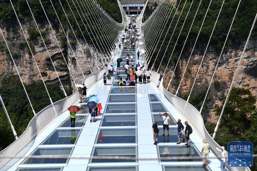 ↑这是2022年7月8日,游人在张家界大峡谷玻璃桥游玩。于2016年对外开放的张家界大峡谷玻璃桥,总长430米、宽6米,距谷底相对高度约300米,桥面由99块全透明玻璃铺设。新华社记者 赵众志 摄