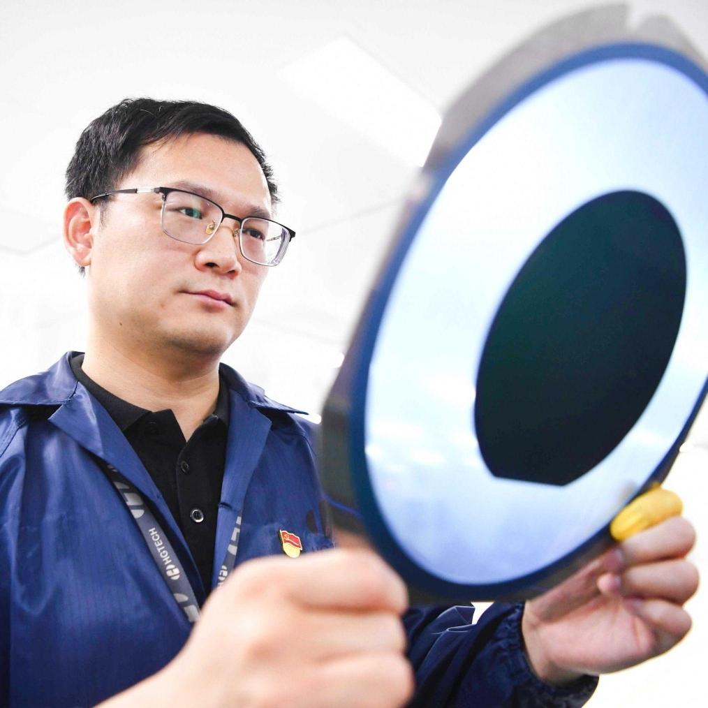 华工激光半导体产品线总监黄伟在检查硅晶圆。长江日报记者 高勇 摄