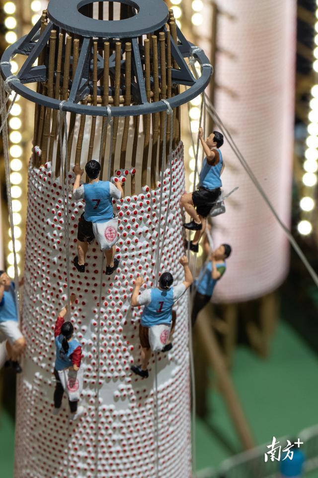 为了搭造这个微缩的竹棚,黎炽明特意请教了多位建筑老师傅,将他们扎竹的手艺应用到模型上,用细小的铁丝代替真实的胶带,把一节节“竹子”进行固定,为此几乎十根手指都被刮花。