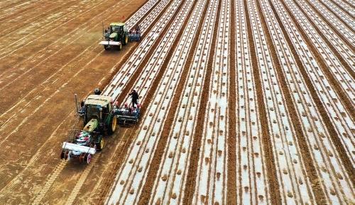 入夏时节,新疆棉花播种接近尾声。广阔的棉田里,搭载北斗卫星导航系统的自动驾驶精量播种机笔直地行驶,完成铺设地膜、滴灌带、播种等工作。
