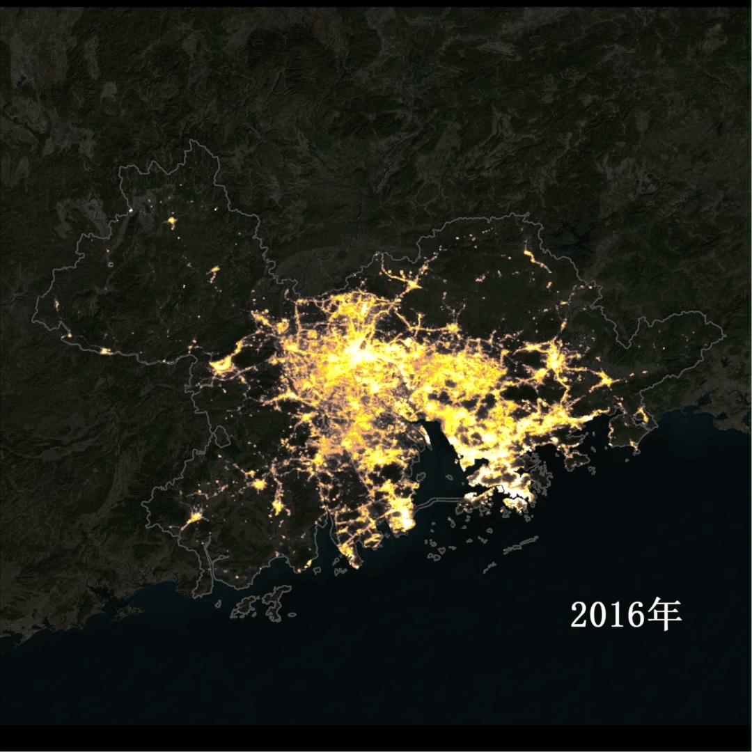 这是“珠海一号”卫星连续9年为粤港澳大湾区绘制生产的夜间灯光遥感图。通过捕捉大湾区这9年灯光分布,能够从一定程度上反映区域经济社会发展的情况。