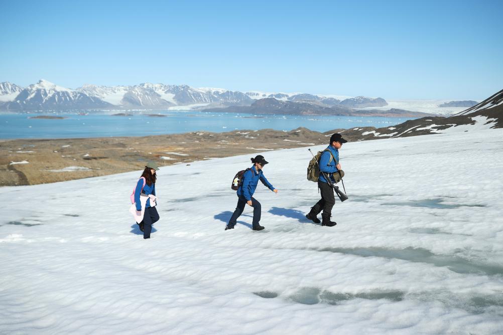 图为2024年6月22日,在挪威新奥勒松,科考队员胡正毅(右)、赵红颖(中)、武小涵外出进行采样工作。(新华社记者赵丁喆摄)