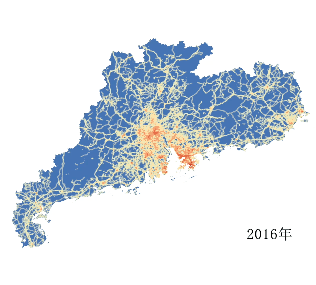 在基于卫星及多源地理信息数据制作的粤港澳大湾区系列POI热力图上,这种思路能够得到更好的印证:颜色越深,代表区域交通路网密度越高。这9年间,广东不断在大湾区内部关键区域布下交通“活子”,也在湾区与粤东西北、广东与其他中部省份的交通工程建设上“小步快跑”。