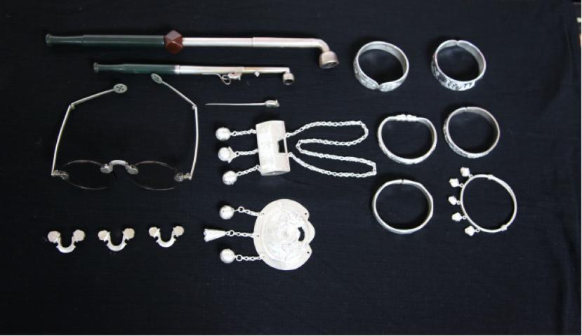 陈仓银器的种类主要是首饰类和器具类。首饰类包括手镯、项圈、长命锁、富贵牌、戒指、耳环、银铃、十二生肖饰品等,器具类则有烟斗、水壶、碗筷、腰带扣等。