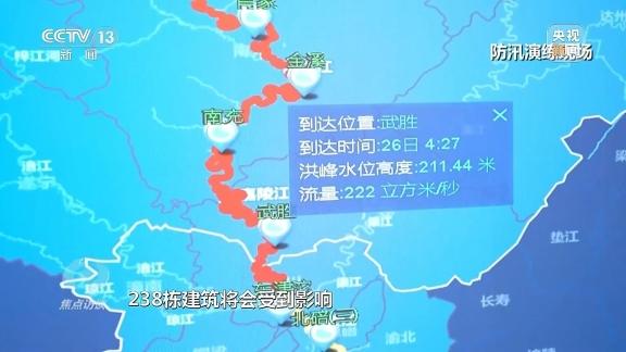 重庆市沙坪坝区应急管理局副局长 熊春蓉:受上游强降雨影响,嘉陵江磁器口段有可能迎来191.7米的过境洪峰,根据我们系统模拟演示,沿江9个街道238栋建筑将会受到影响,届时需要对6595名居民进行转移和疏散。