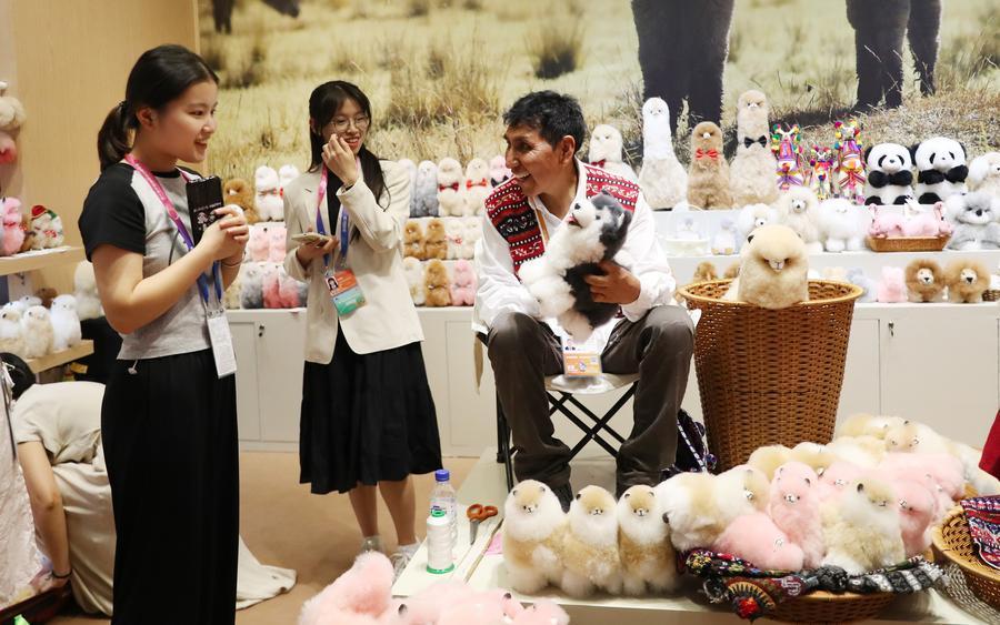 马马尼大叔在上海进博会“温暖驼”品牌展台内向一名参观者展示刚制作完成的羊驼玩偶(2023年11月5日摄)。新华社记者 方喆摄
