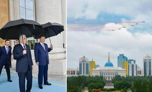 托卡耶夫为习近平举行隆重欢迎仪式。总统府大厅气势恢宏,礼兵威武挺拔。两国元首分别同对方陪同人员一一握手致意。两国元首登上检阅台,军乐团奏中哈两国国歌。习近平在托卡耶夫陪同下检阅仪仗队。