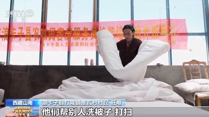 旺堆:村民有这样的观念,他们帮别人洗被子、打扫,他们都不愿意,他们试了以后,他们一年里面得到了25000元的收入,慢慢他们把传统的观念放下了。