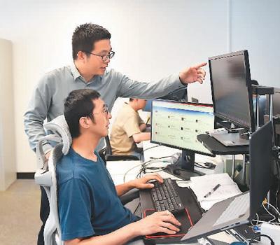 2024年5月29日,在北京三合智能科技有限公司,人工智能技术负责人与研发人员沟通开发注意事项。新华社记者任超摄
